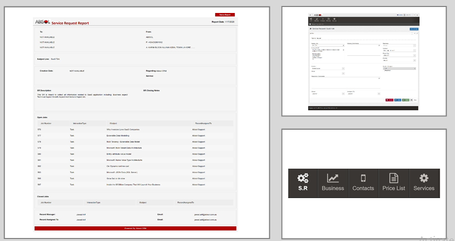 At a Glance Abisol CRM Multi-Tenant Application Highly customizable Designed to manage SOPs around Customer Lifecycle Designed to make Business Process & Interactions easy and Wide range of Features Wide range of Modules User can pick the module/s according to their desire and needs Pay for what you need Multiple Security Roles for a User (Creator, Moderator, Super User, Admin) Modules Marketing Module Marketing Module revolves around Marketing Campaign & Lead Management. The aim is to manage & nourish leads & get a sale consent. Sales Module Sales Module is revolves around Inquiry & Quotation Management. The aim is to manage & nousrish inquiry & secure a sale. Service Module Service Module is revolves around Service Request & Task Management. The aim is to manage & resove Customer query effectively. Workload Management (WLM) WLM revolve around Task & Team Workload Management. The aim is to manage your team & serve customer better. Orders Module Orders Module revolve around Food & Retail Management. The aim is to enable a store/shop to be able to sell In-Store & online using E-commerce Our Architecture Developed with Microsoft Technologies Hosted on Microsoft Azure Cloud Strong & Secure Designed to keep your data truly yours. Inherited with Microsoft Azure’s secure Fast Processing Backed up by Microsoft SQL Server © Developed using the latest gear and tech (MVC – C# and Bootstrap CSS) Design that makes enhancements and upgrades easy and quick Designed for every type of Small and Medium Workload Management Organized Tasks Efficient Dashboard Keeps you aware of Team Wide task Statuses Business Defined Classification and Statuses for Tasks Number of jobs/tasks per classification Create/Edit Generic Tasks Assign tasks to your team mates Toggle between open and closed tasks. Quick Search Tasks Maintain notes against each interaction. Upload files in Upload large (GB) files in Marketing Easily Create & Manage Marketing Data/Lists, Marketing Campaigns Convert Marketing List records into Qualified Leads during your Marketing Campaign Run Convert Qualified Leads into Businesses and Contacts Create interactions/tasks related to above Export your records to CSV Quick search through your Sales Create & Manage Inquiries Collect quick inquiries and generate leads on the fly Inquiries related to Leads, Businesses and Contacts Create Interactions related to Inquiries Toggle between open inquiries and closed Manage Products Orders Create & Manage your Products Manage Sales Register (Sales Register) Collect orders in 2 different styles and scopes (Point of Sale Style & Retail Style). Manage complete POS Order Life Cycle (Ideal for Restaurants) Choose the business process that suits you among four Manage your Tax See the Total Sales at Business Day Dine In, Take Away & Deliver options before collecting an Services Create & Manage your Services Create & Manage Service Requests related to existing customers (Contacts & Businesses). Generate PDF Report regarding a Service Create Interactions (Tasks) related to Service Request. Administration Portal for Resellers Keeps track of all sales acquired by a reseller Abisol setup a Reseller account on request